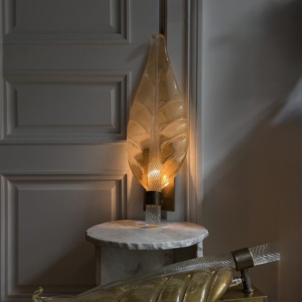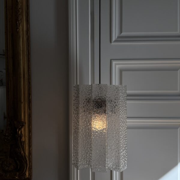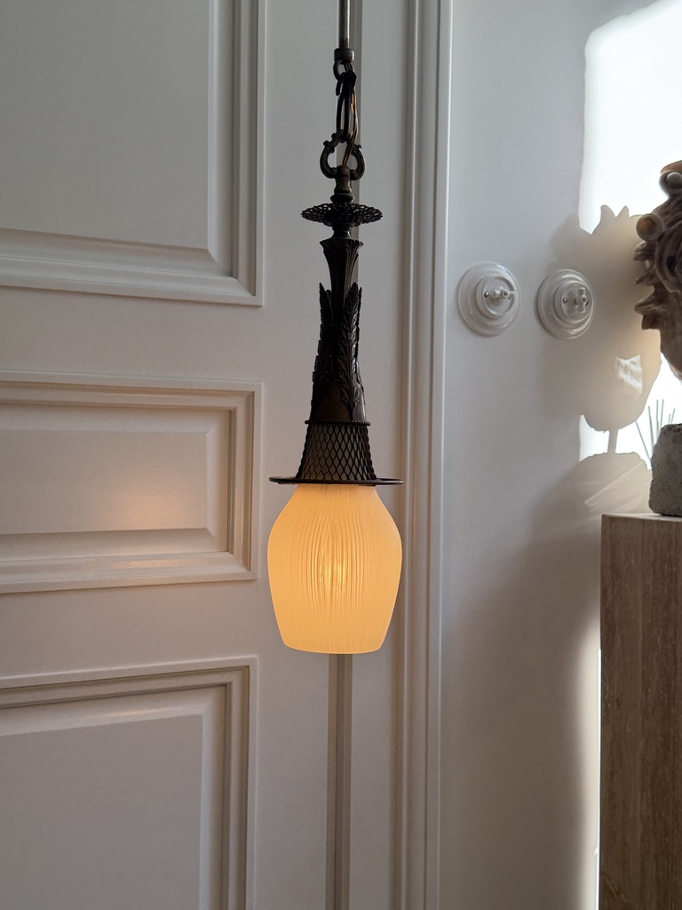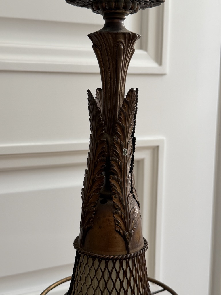 Lampa jednopunktowa wykonana z brązu, posiada piękne rzeźbiarskie detale i strukturalny klosz o ciepłej miodowej barwie. Lampa posiada dodatkowy abażur, zaprezentowany na zdjęciach, który może być dodatkowo zakładany. Wyprodukowana w Holandii, w latach 20. XX wieku.