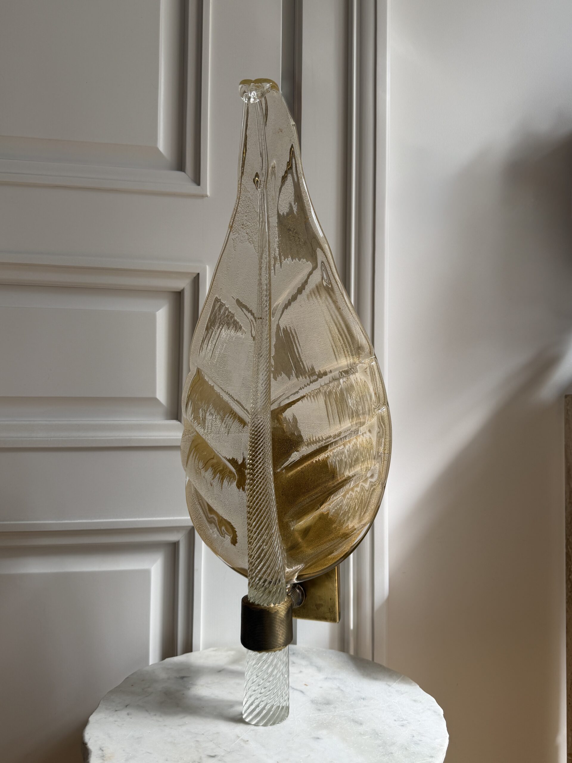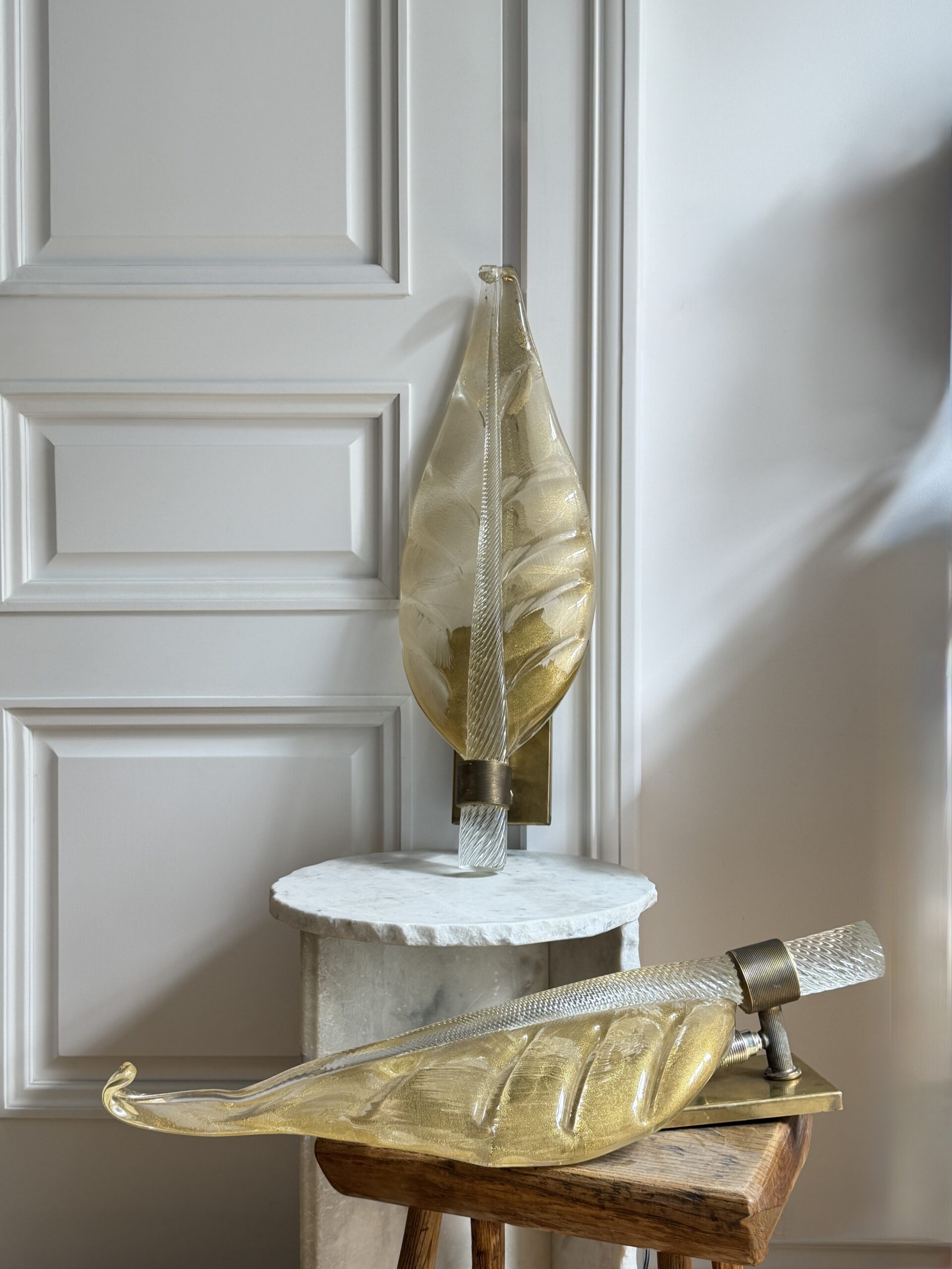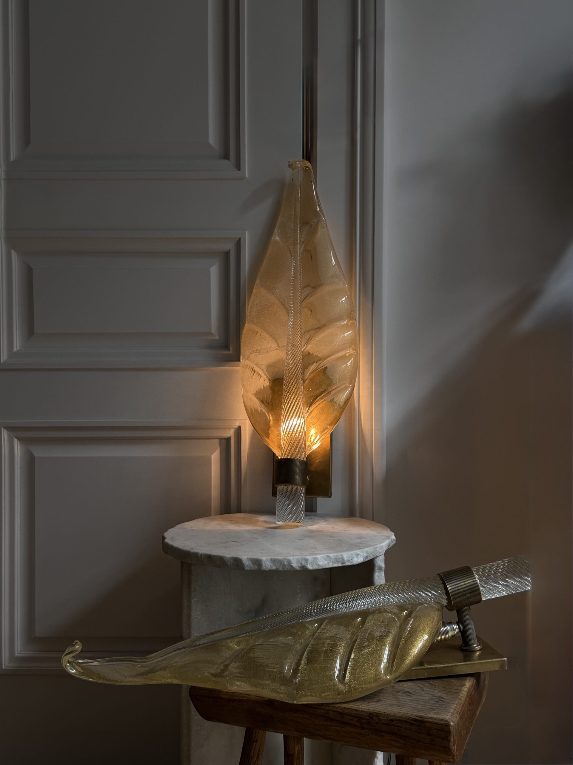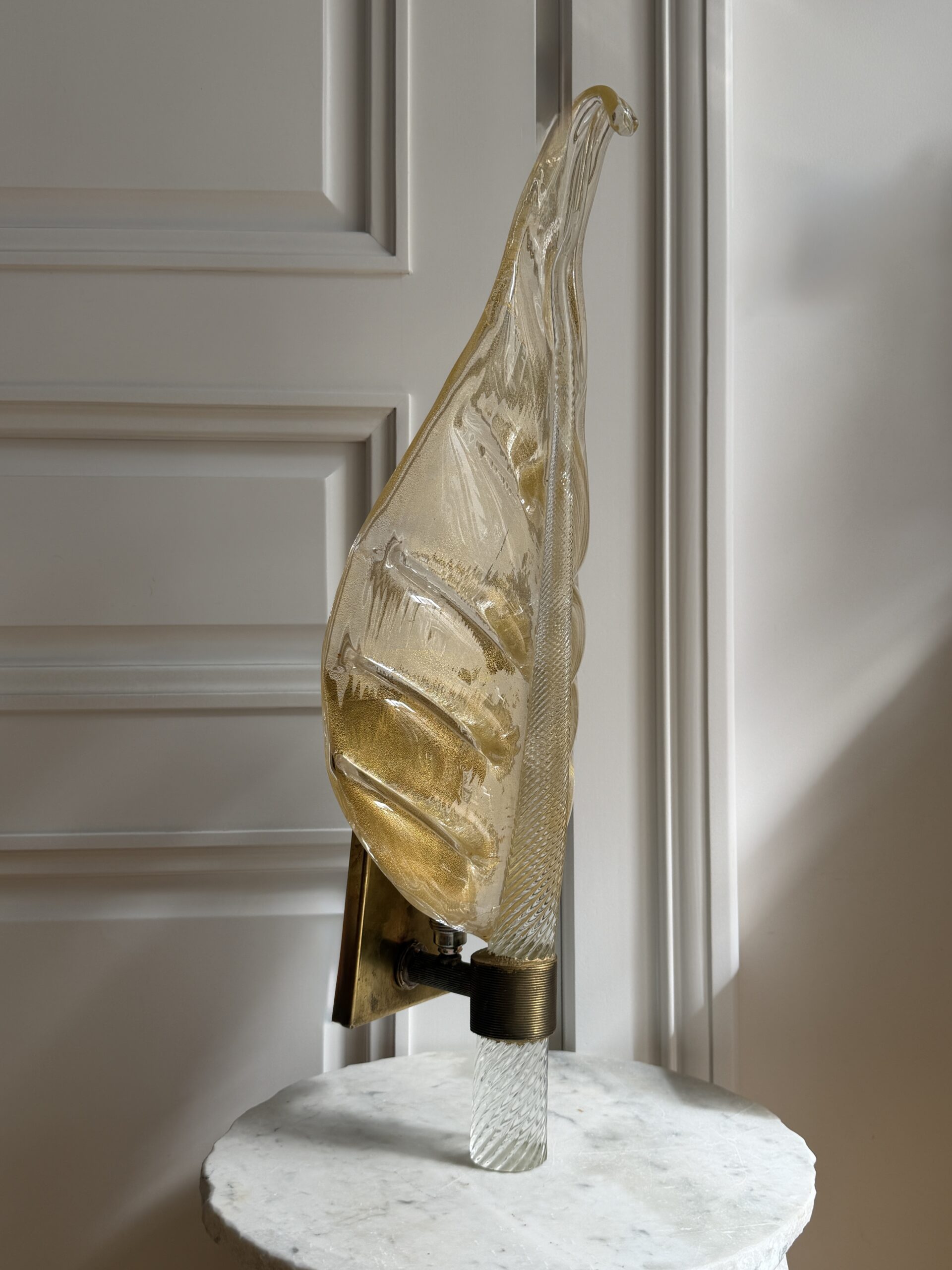 Para kinkietów wykonanych z ręcznie dmuchanego szkła Murano w kształcie liści z mosiężną obręczą i stelażem. Kinkiety przypisywane słynnej manufakturze Barovier & Toso. Wyprodukowane we Włoszech, w latach 70.