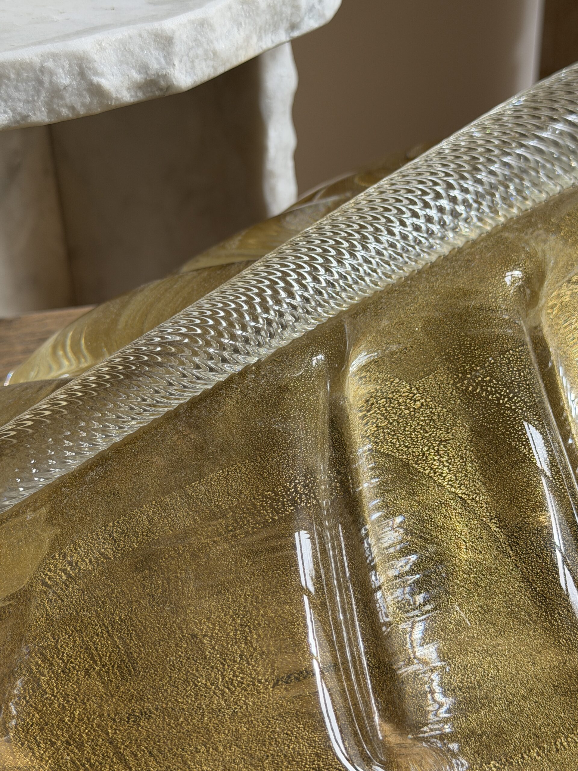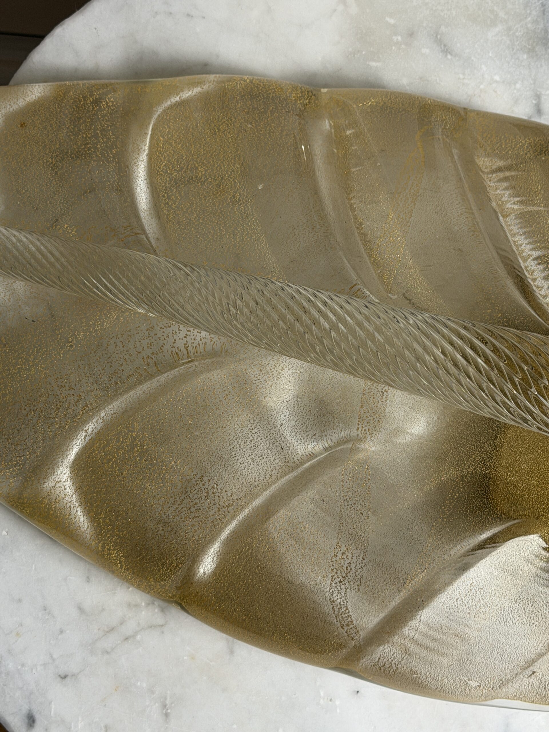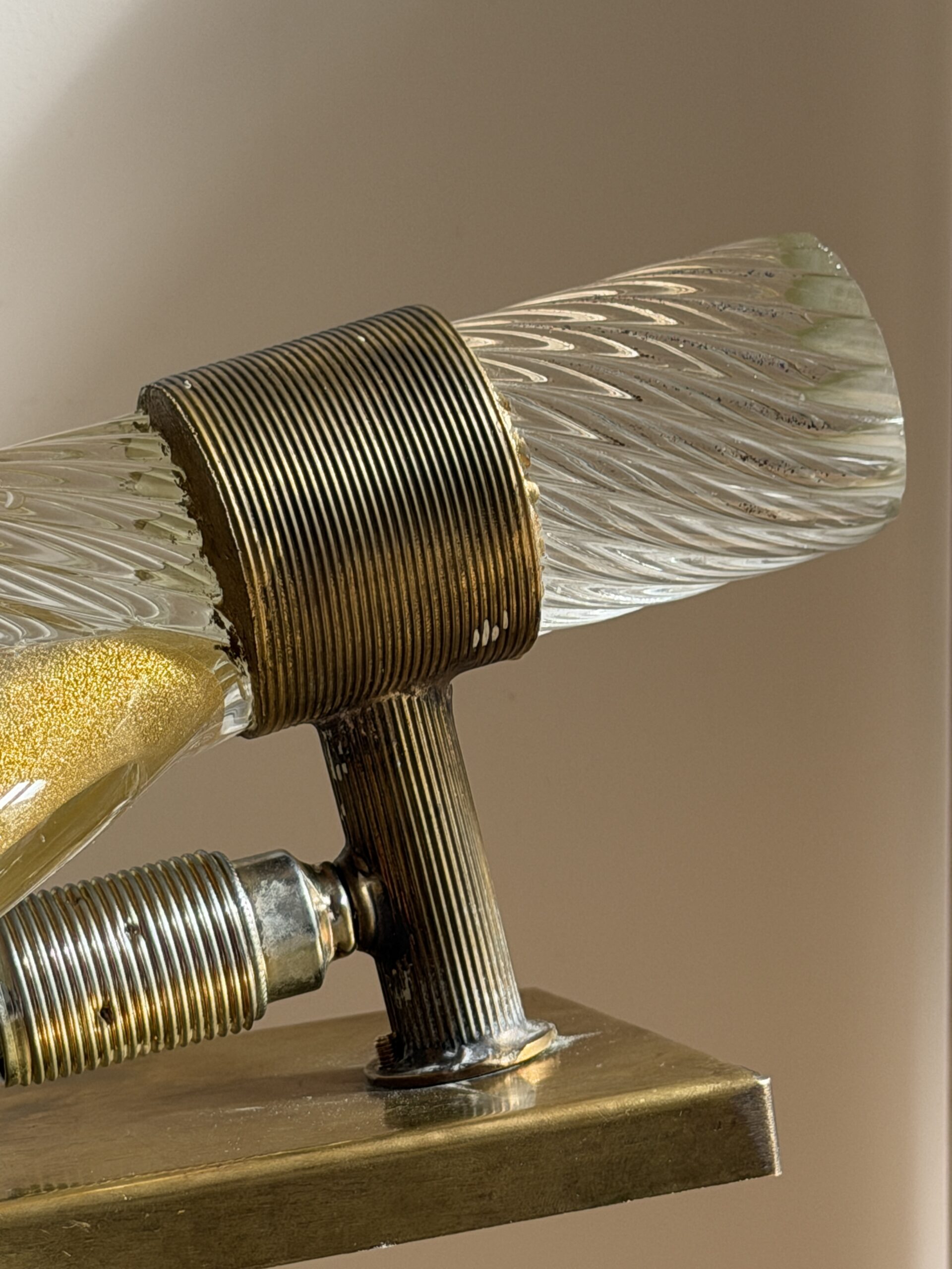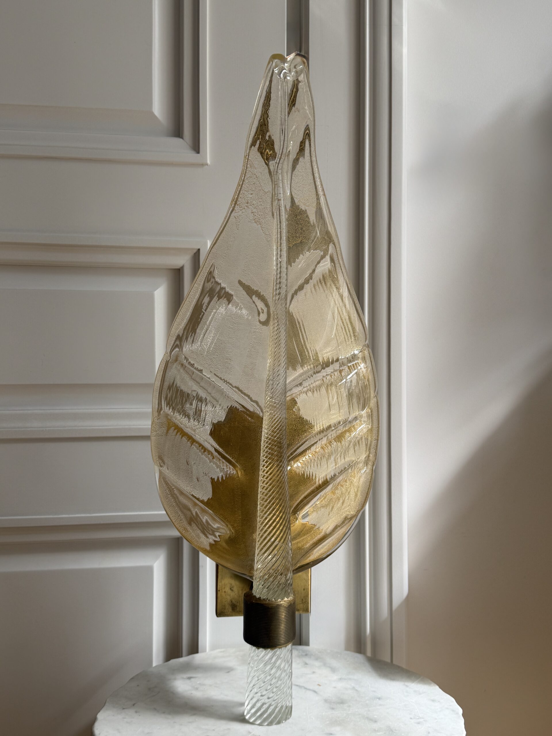 Para kinkietów wykonanych z ręcznie dmuchanego szkła Murano w kształcie liści z mosiężną obręczą i stelażem. Kinkiety przypisywane słynnej manufakturze Barovier & Toso. Wyprodukowane we Włoszech, w latach 70.