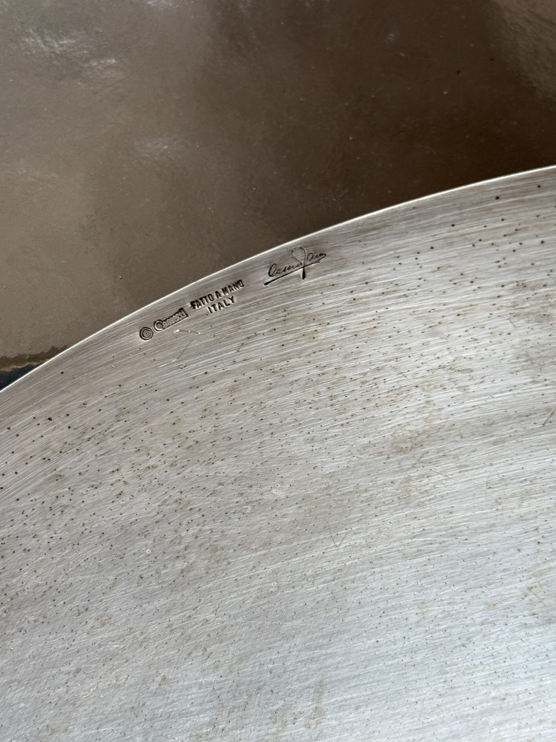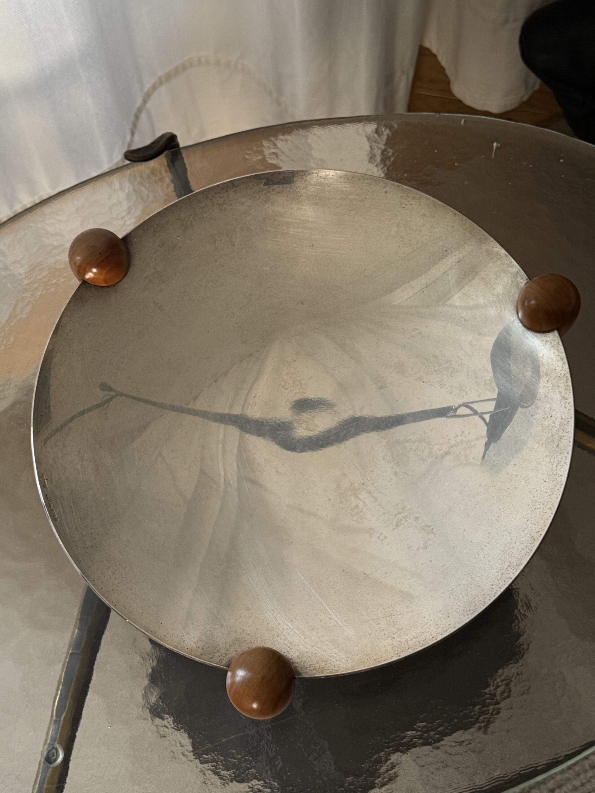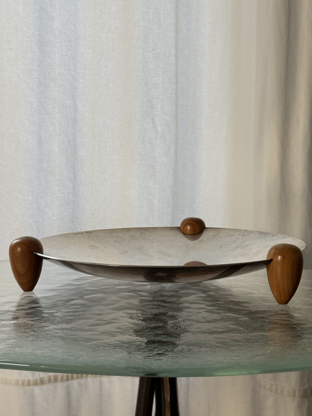 Duża posrebrzana patera na drewnianych nogach, wyprodukowana przez Cassetti we Włoszech, lata 70. Sygnowana na rancie.